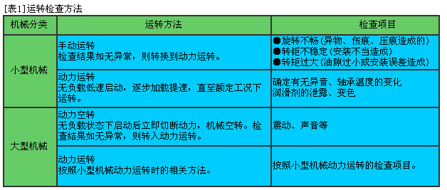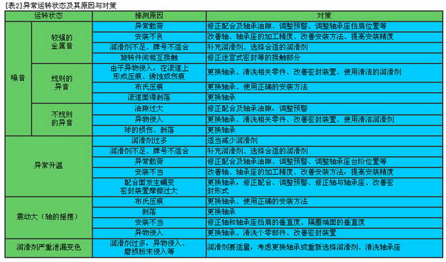 · 軸承安裝后,應(yīng)立即進(jìn)行運(yùn)轉(zhuǎn)檢查,以確認(rèn)安裝是否正確。[表1]給出了運(yùn)轉(zhuǎn)檢查的方法。若在運(yùn)轉(zhuǎn)檢查中發(fā)現(xiàn)異常,應(yīng)立即停機(jī),對機(jī)器進(jìn)行檢查,常見問題的產(chǎn)生原因及對策參見[表2]。