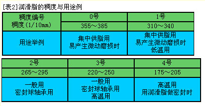 1.脂潤滑脂潤滑是由基礎(chǔ)油、增稠劑及添加劑組成的。使用時(shí),應(yīng)選擇適合于軸承使用條件的潤滑脂。即使是同類潤滑脂,由于生產(chǎn)廠家及商標(biāo)不同,性能上可能會有較大的差別。在選擇的時(shí)候要特別注意。潤滑脂的稠度與用途的例子參見[表2]