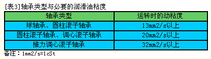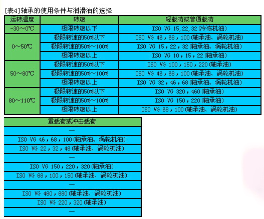 2.油潤滑油潤滑方法有油浴、滴油潤滑、飛濺潤滑、循環(huán)供油、噴射潤滑、油霧潤滑以及油氣潤滑。與脂潤滑相比,油潤滑適合于高速高溫環(huán)境下使用。特別是需要向外部散熱時(shí),采用油潤滑更為合適。對油潤滑來說,由于要考慮軸承的運(yùn)轉(zhuǎn)溫度,因此選擇適當(dāng)粘度的潤滑油十分重要。一般情況下,轉(zhuǎn)速越高,使用的潤滑油粘度越低,載荷越大,使用的潤滑油粘度越高。在普通使用條件對應(yīng)的運(yùn)轉(zhuǎn)溫度下,潤滑油的粘度基準(zhǔn)參見[表3] 作為選擇時(shí)的參考,[表1]給出了潤滑油的粘度與溫度的關(guān)系。[表4]給出了按軸承使用條件選擇潤滑油的例子。